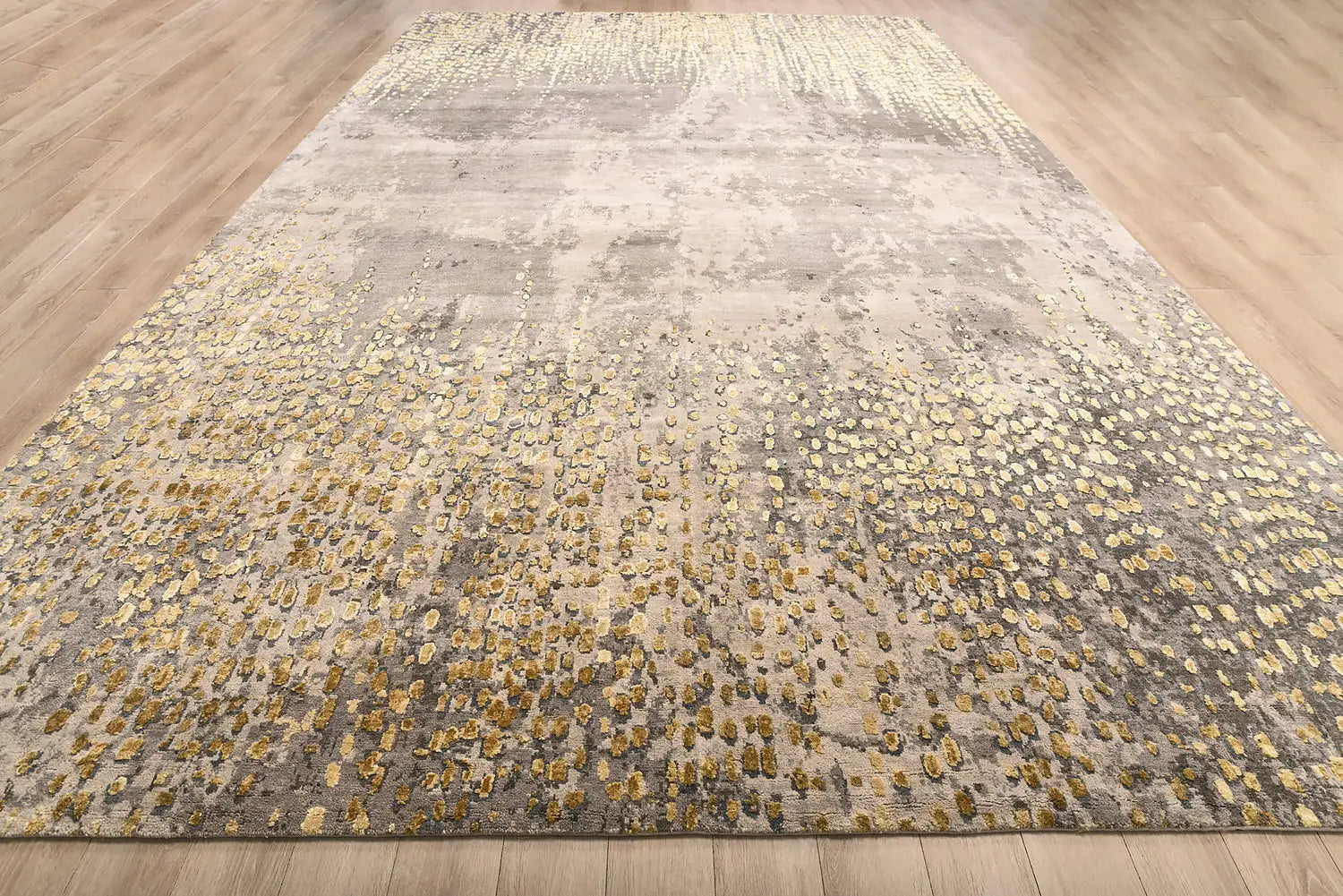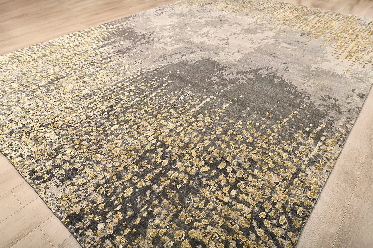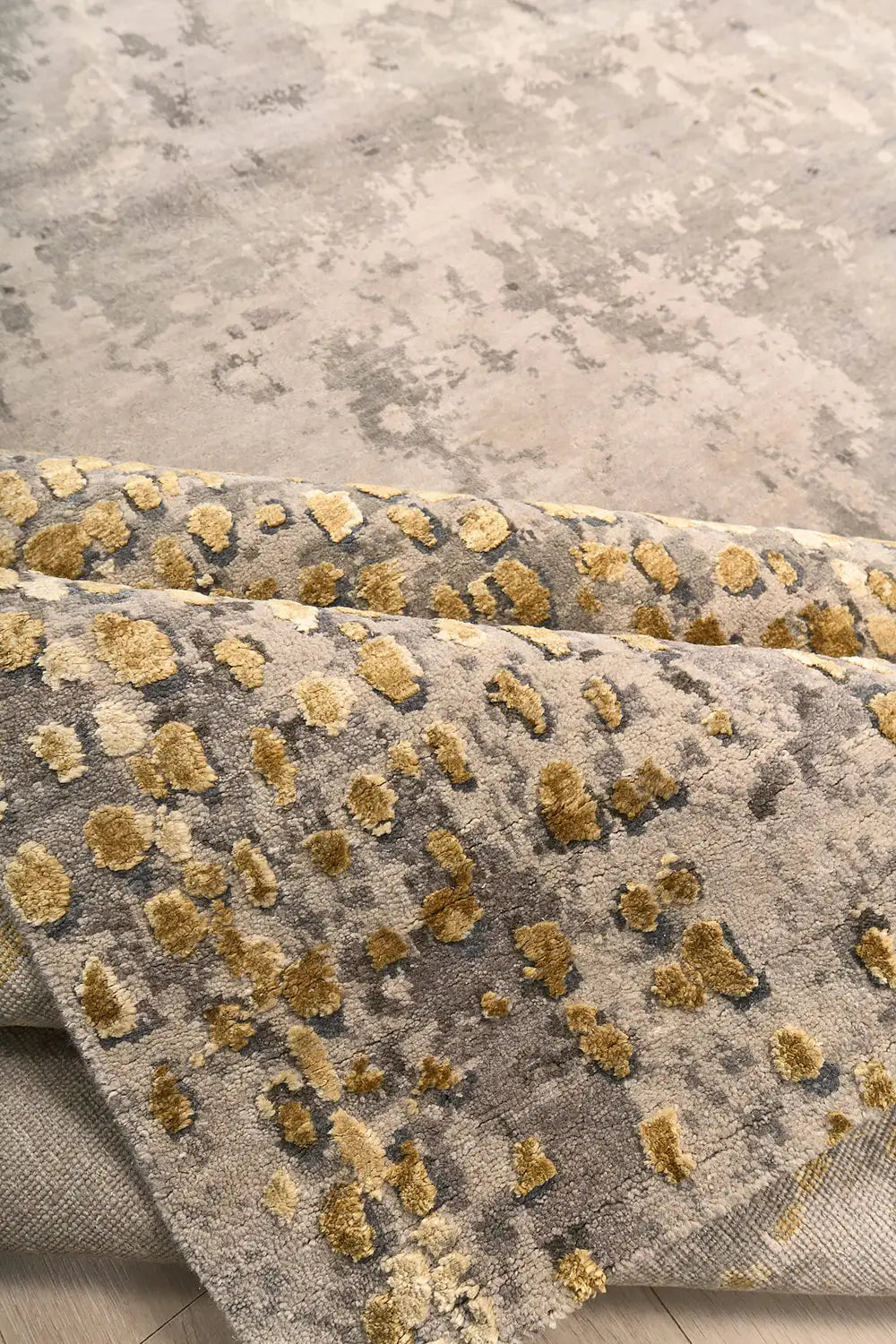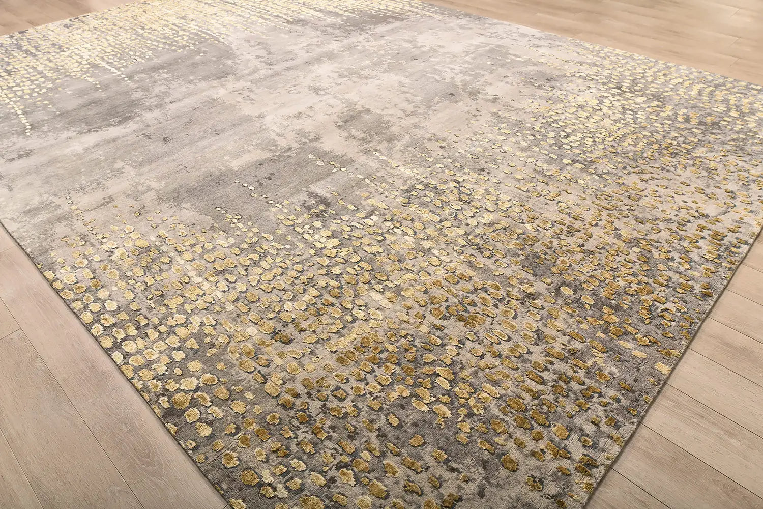 The combination of gold and grey tones creates a sophisticated balance between warmth and restraint. Metallic-inspired highlights interact with soft neutral textures, allowing the rug to integrate naturally into contemporary interiors while maintaining a distinct decorative presence.