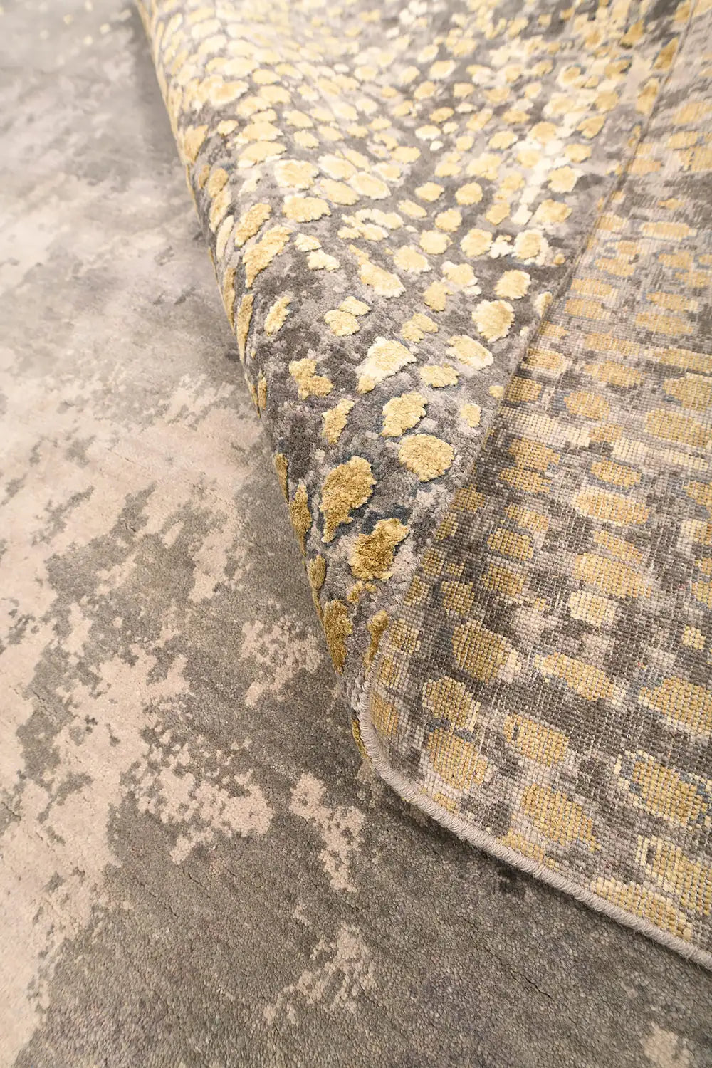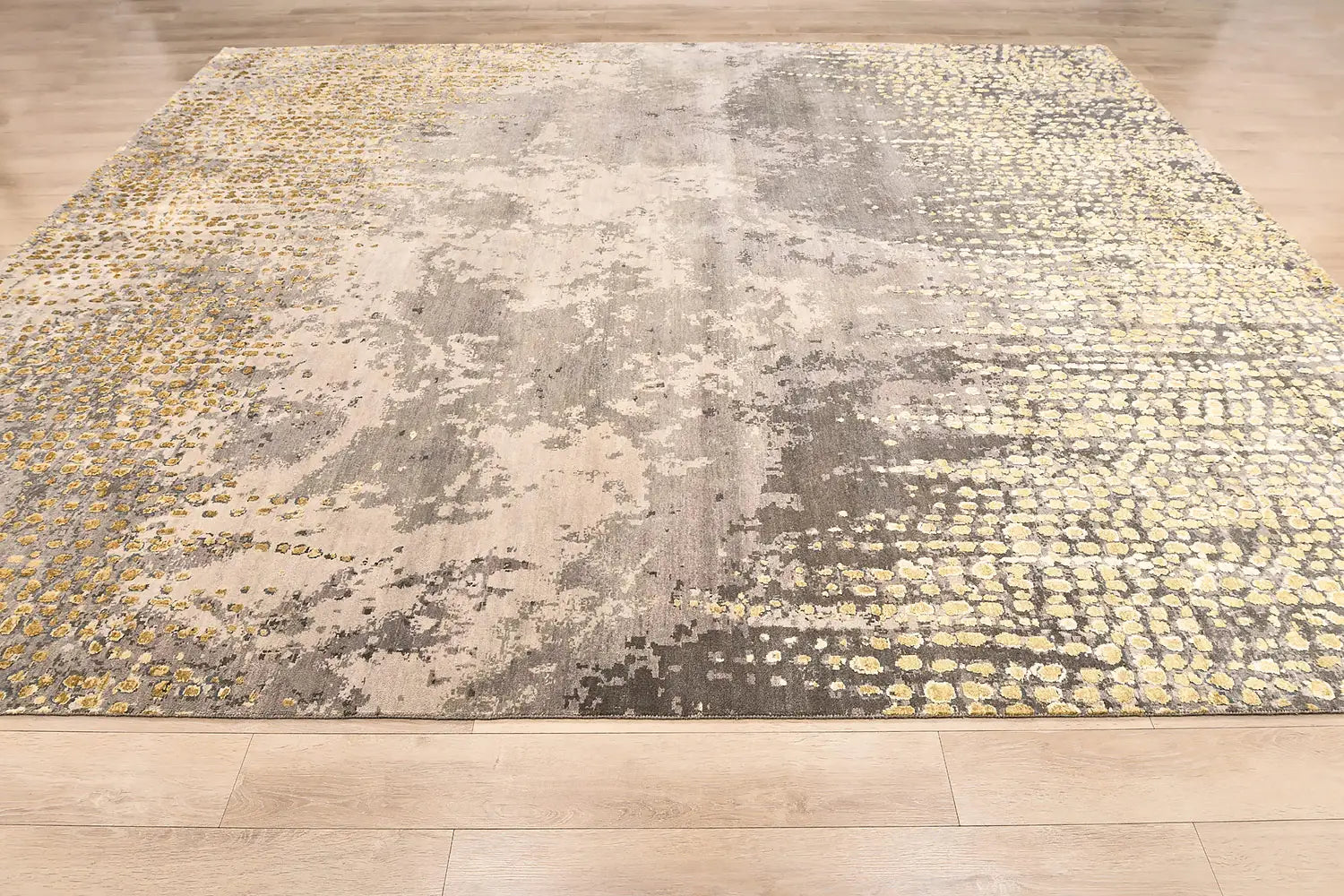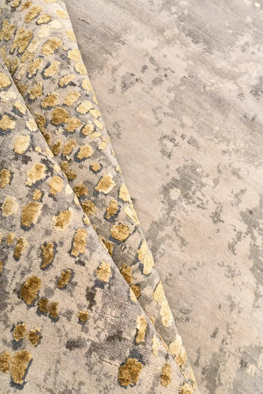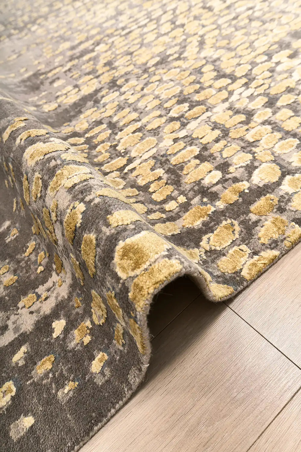 The combination of gold and grey tones creates a sophisticated balance between warmth and restraint. Metallic-inspired highlights interact with soft neutral textures, allowing the rug to integrate naturally into contemporary interiors while maintaining a distinct decorative presence.