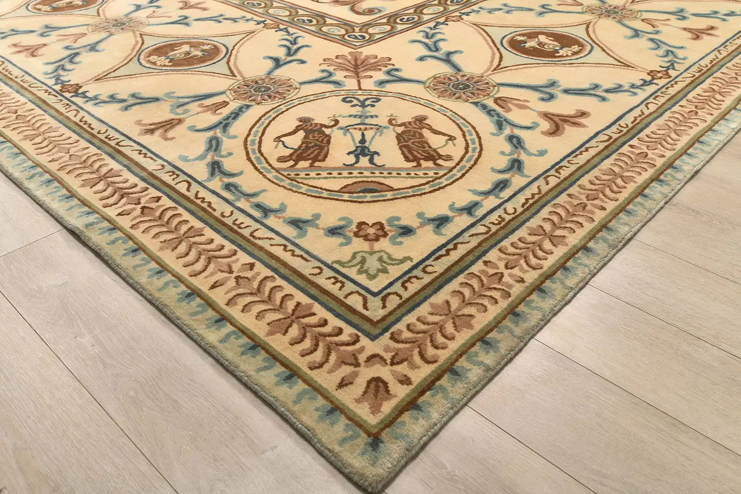 The palette of ivory, beige, terracotta, soft blue, and multicolor accents creates warmth and visual sophistication, allowing the rug to remain expressive while harmonizing with classical interior palettes. The interplay of botanical forms and geometric order gives the composition both decorative richness and formal elegance.