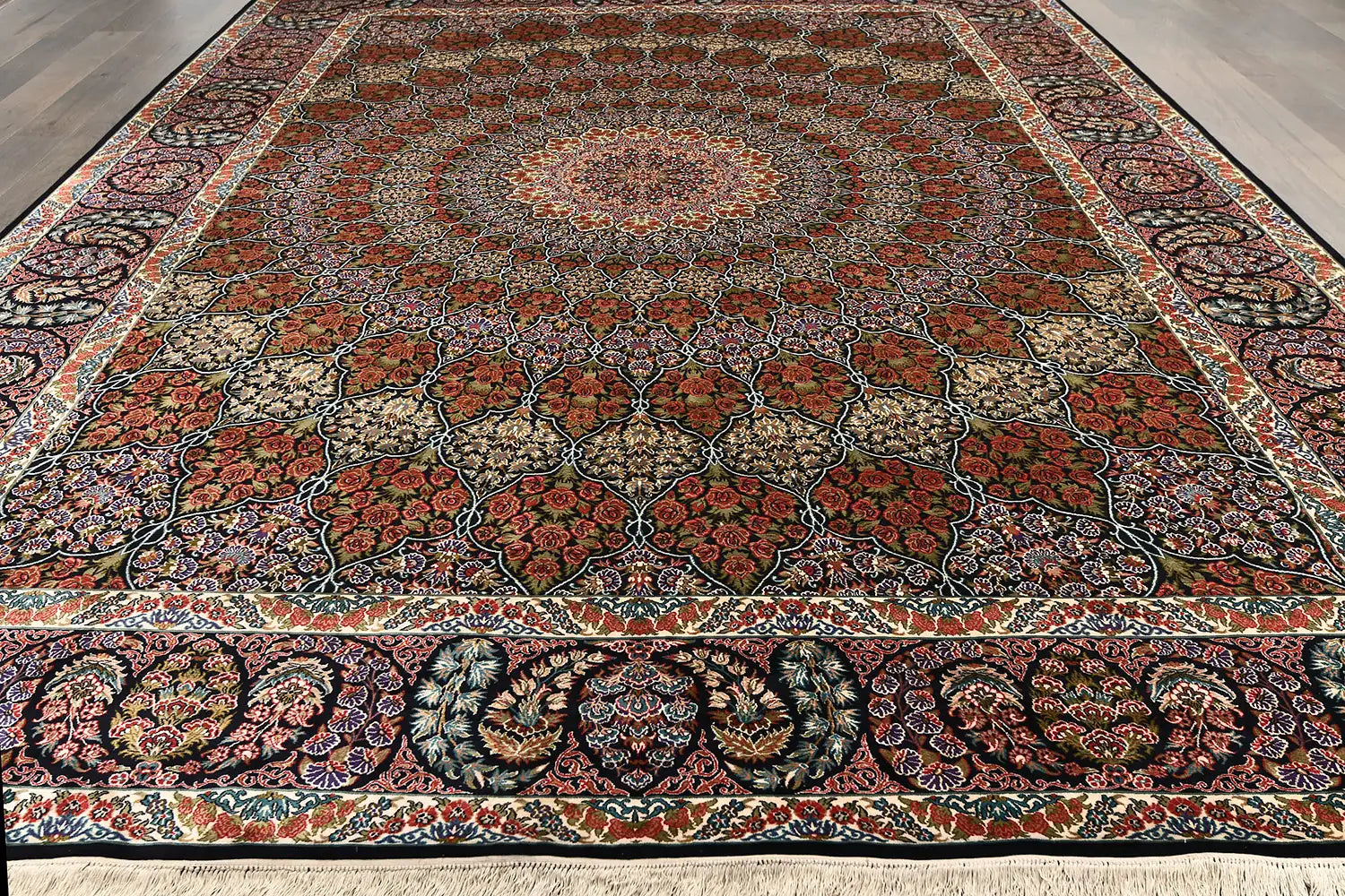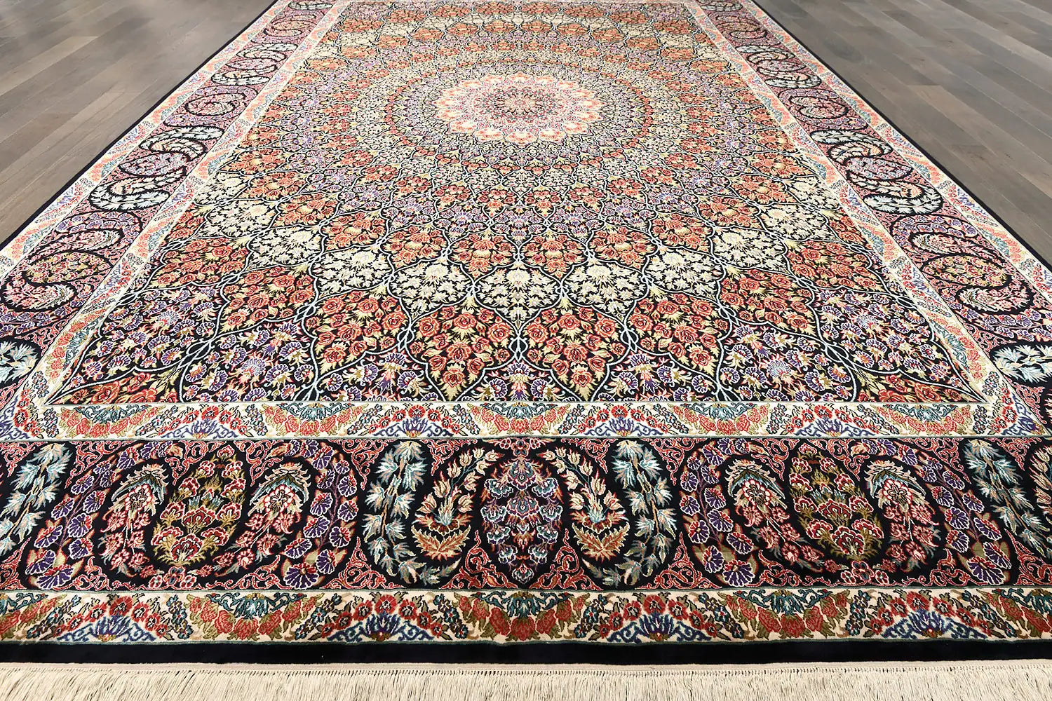 Imperial Dome Silk is a masterfully handwoven silk rug created with extraordinary precision and classical decorative richness. Its composition is built around a refined central medallion surrounded by elaborate floral ornamentation, reflecting the balance, symmetry, and sophistication associated with historic Persian-inspired design traditions.