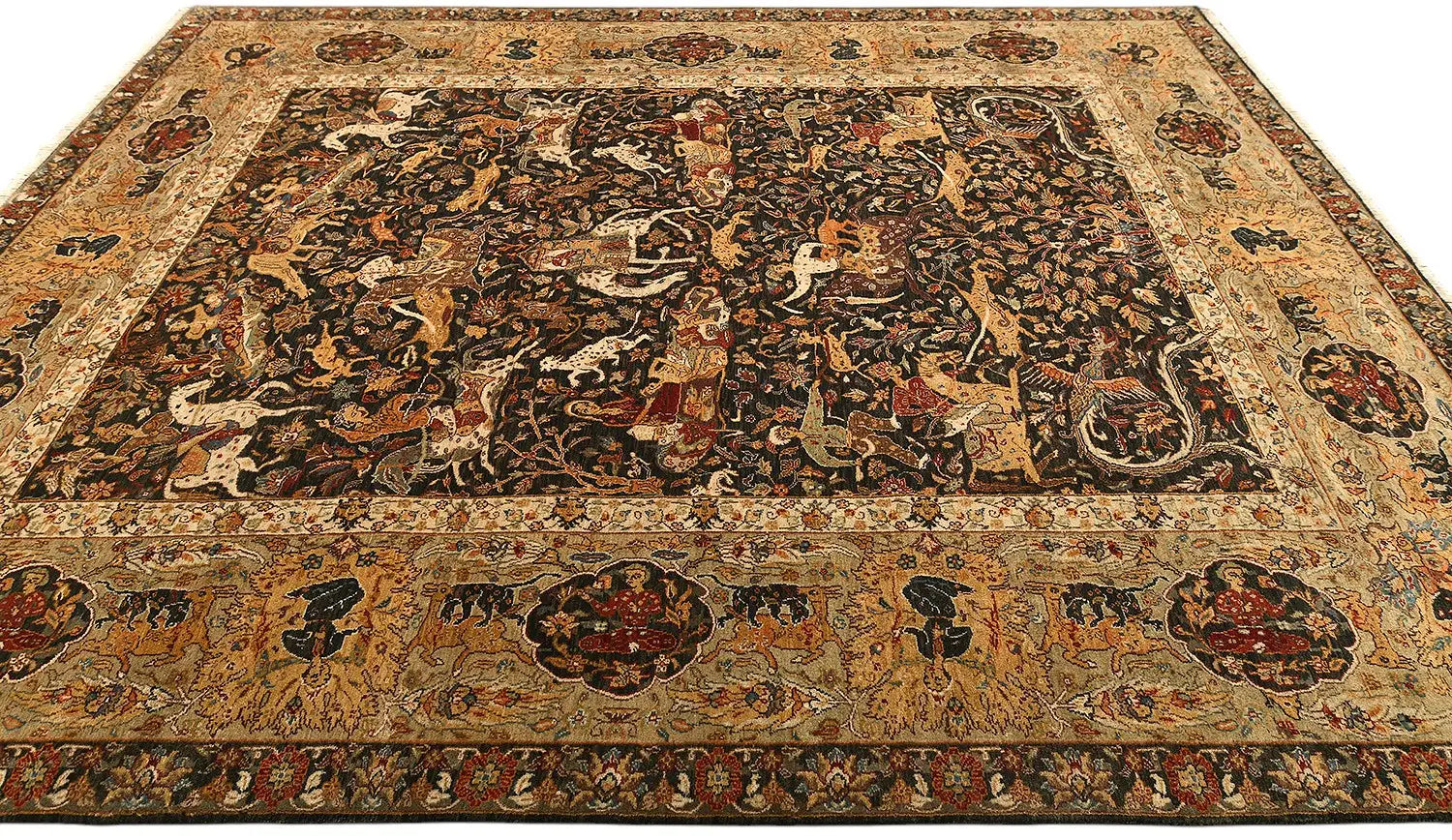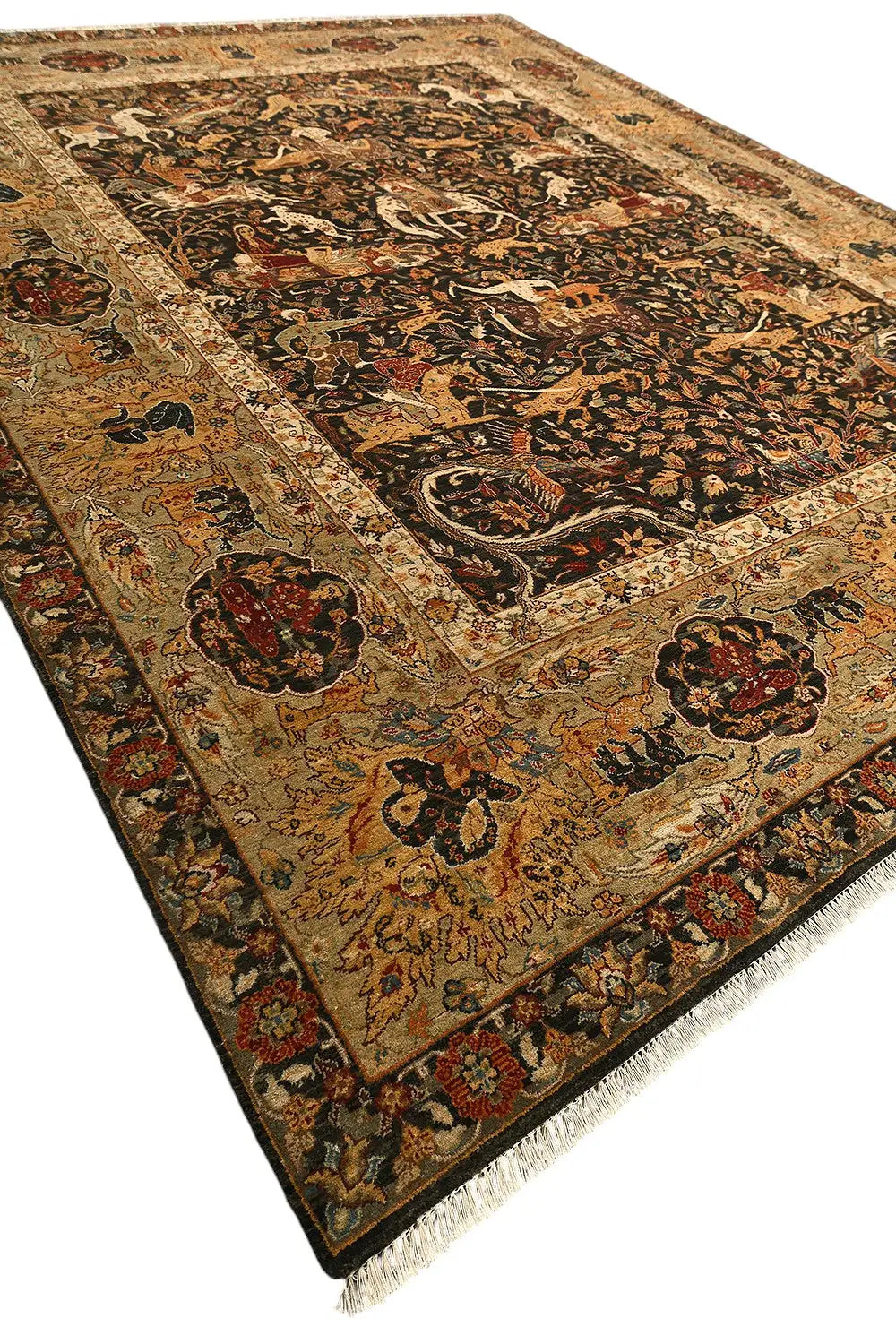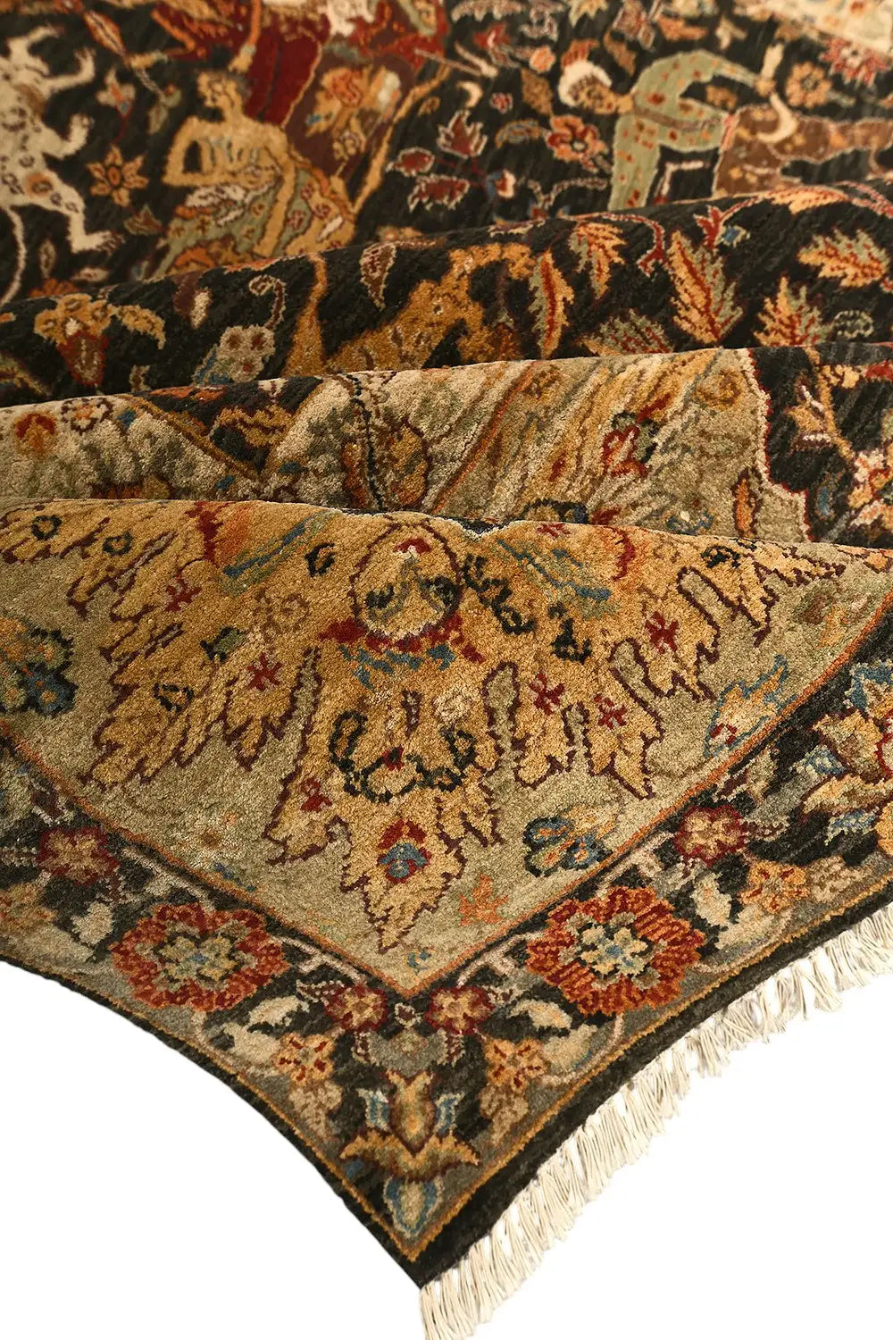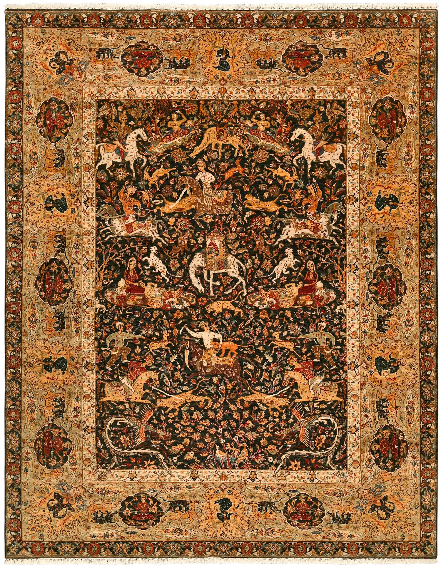 Imperial Hunt Heritage is a handwoven wool rug created with exceptional knot density and refined craftsmanship, designed for interiors where detail, depth, and heritage matter. Its richly composed central field presents elaborate hunting scenes with riders, animals, and ornamental motifs inspired by classical Eastern weaving traditions, giving the piece a strong artistic identity and timeless visual presence.