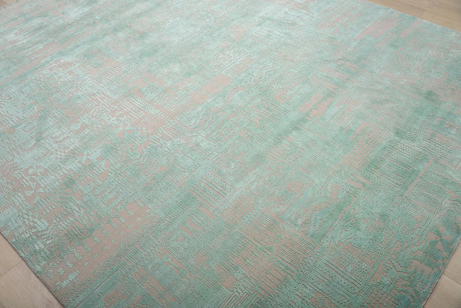 Mint Geometry is a contemporary handwoven rug defined by fresh color, abstract structure, and refined geometric movement. Its composition combines soft architectural rhythm with artistic spontaneity, creating a surface that feels modern, expressive, and visually balanced.