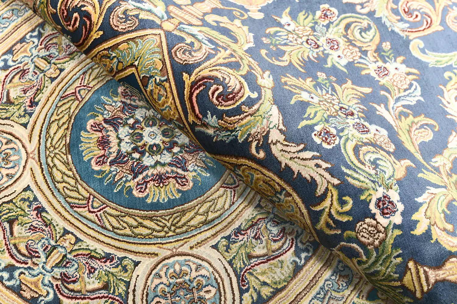 Its high knot density - exceeding 900,000 knots per square meter - gives the design remarkable precision and depth, making every decorative element appear sharp, refined, and richly layered. The balanced blue and multicolor palette introduces freshness and sophistication while preserving a classic luxurious character.