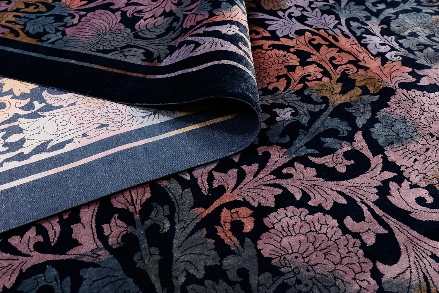 The palette of sapphire blue, violet, and deep navy creates a luxurious atmosphere, while delicate contrasting accents introduce freshness and lightness to the design. This combination gives the rug both depth and elegance, making it especially suited for interiors where refined color and artistic detail are central.