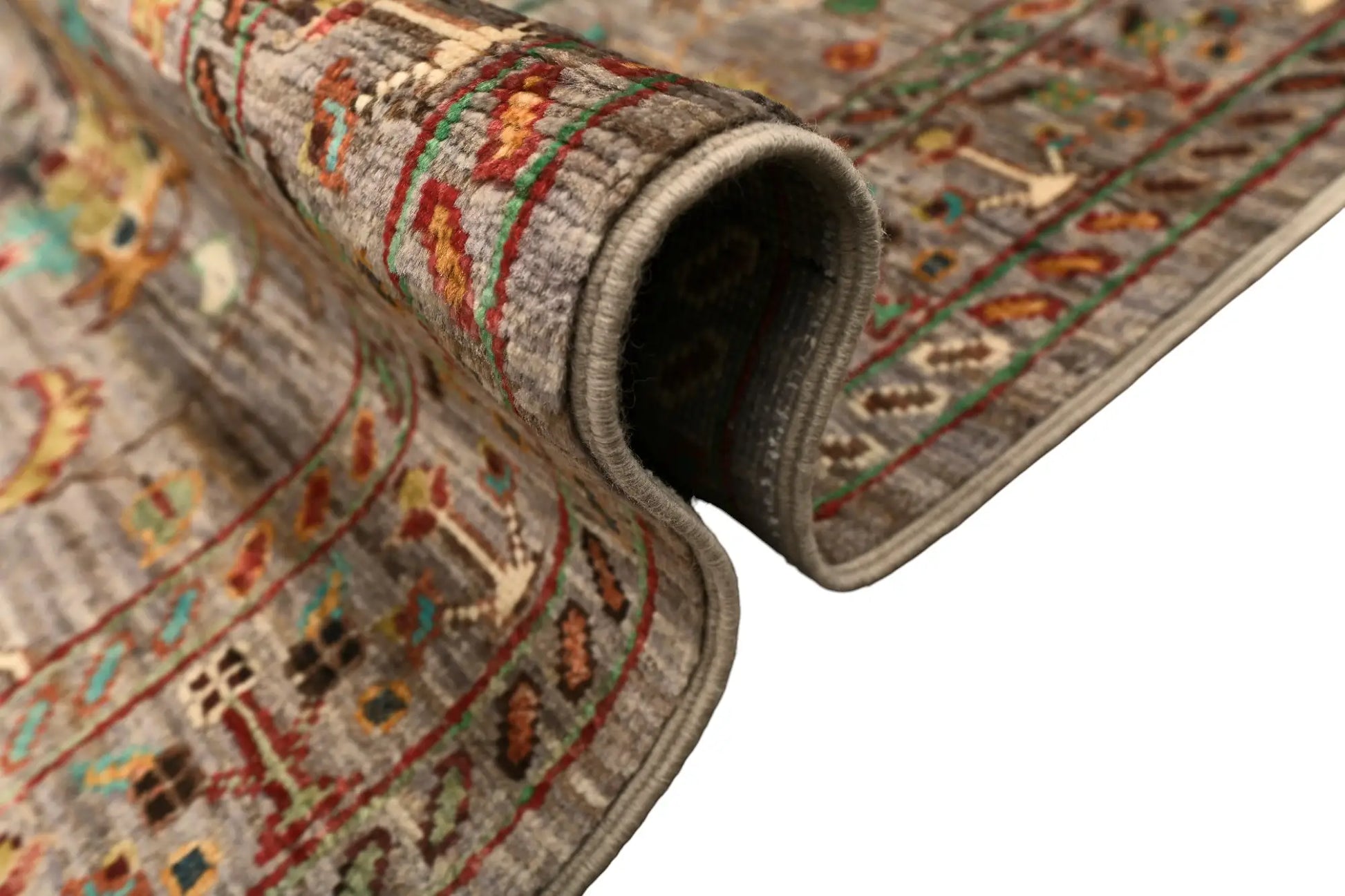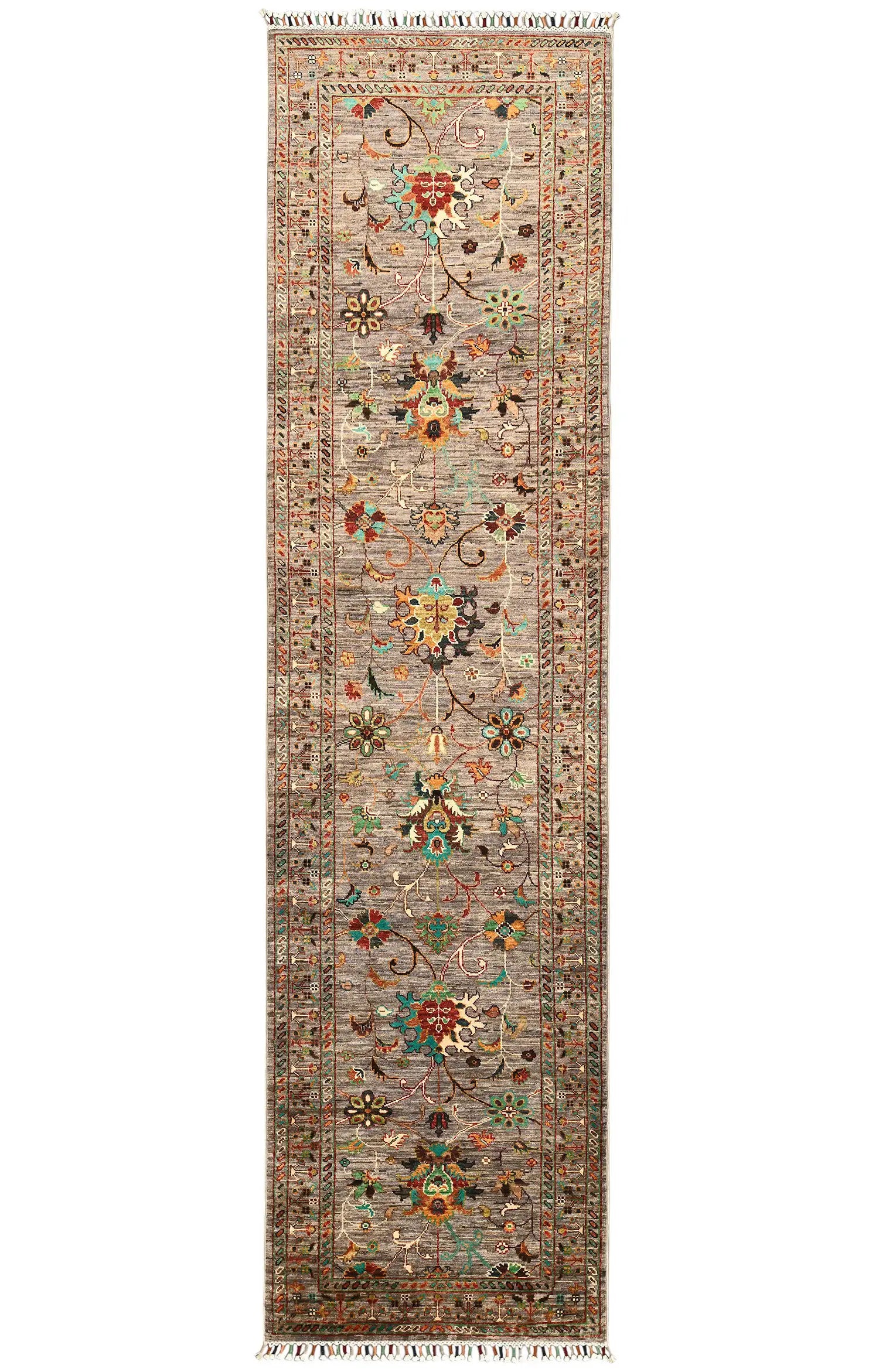 Its elongated composition allows floral motifs and flowing ornamental lines to unfold with graceful rhythm, while the grey base with multicolor accents introduces freshness and subtle decorative contrast. The neutral foundation makes the runner easy to integrate into both classical and modern spaces.