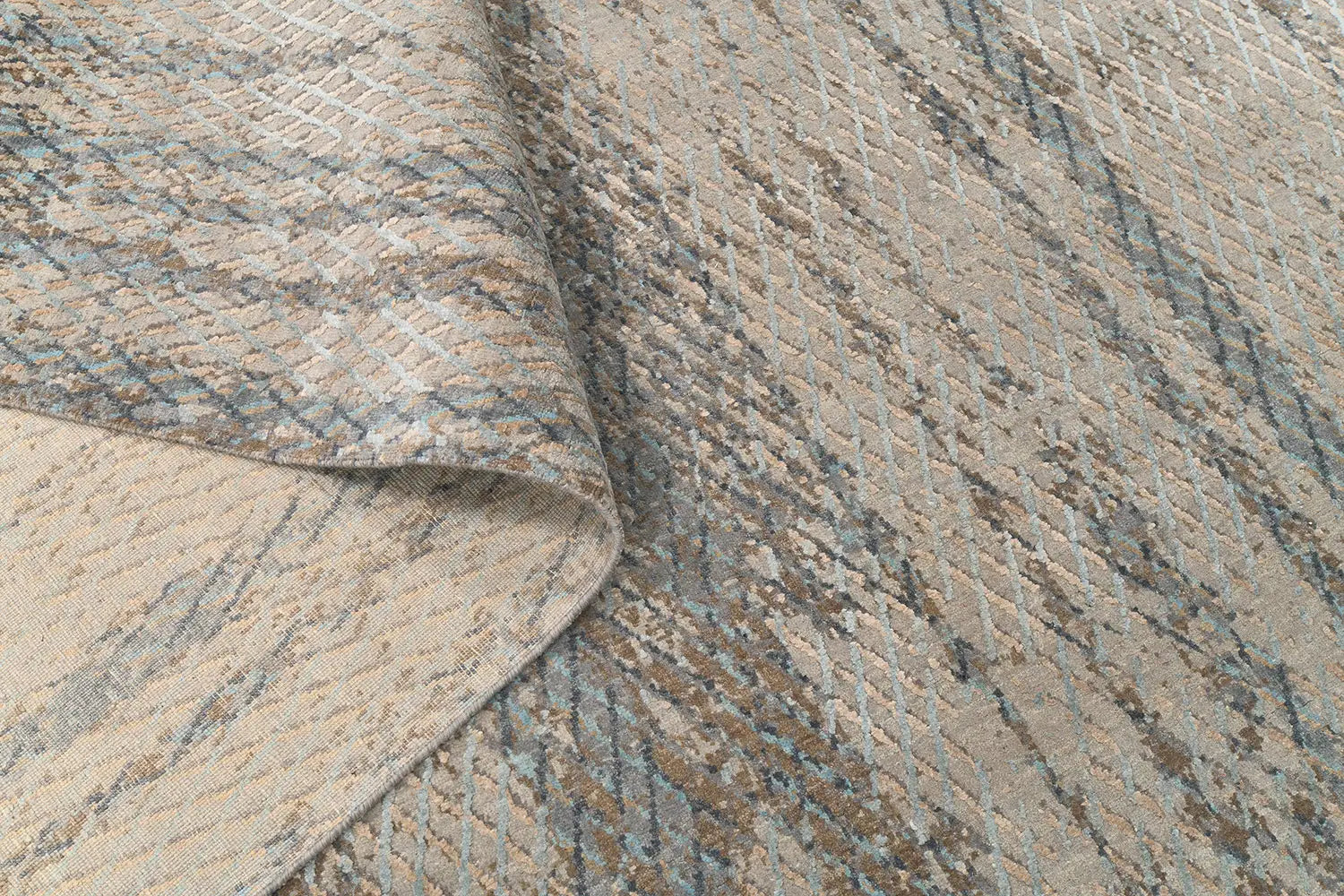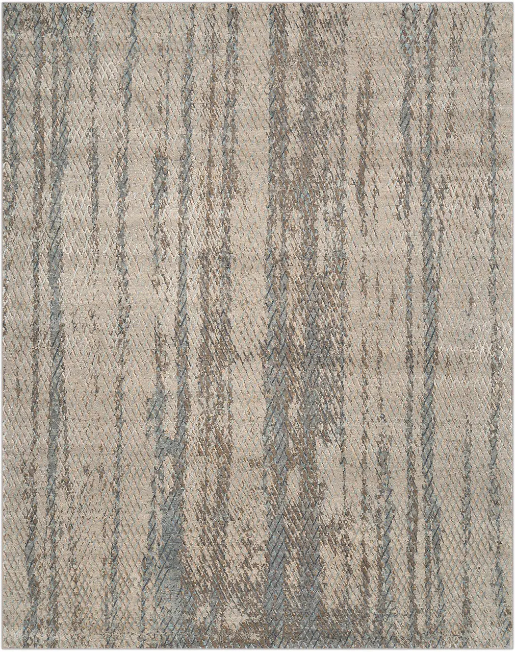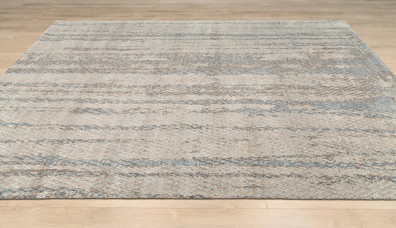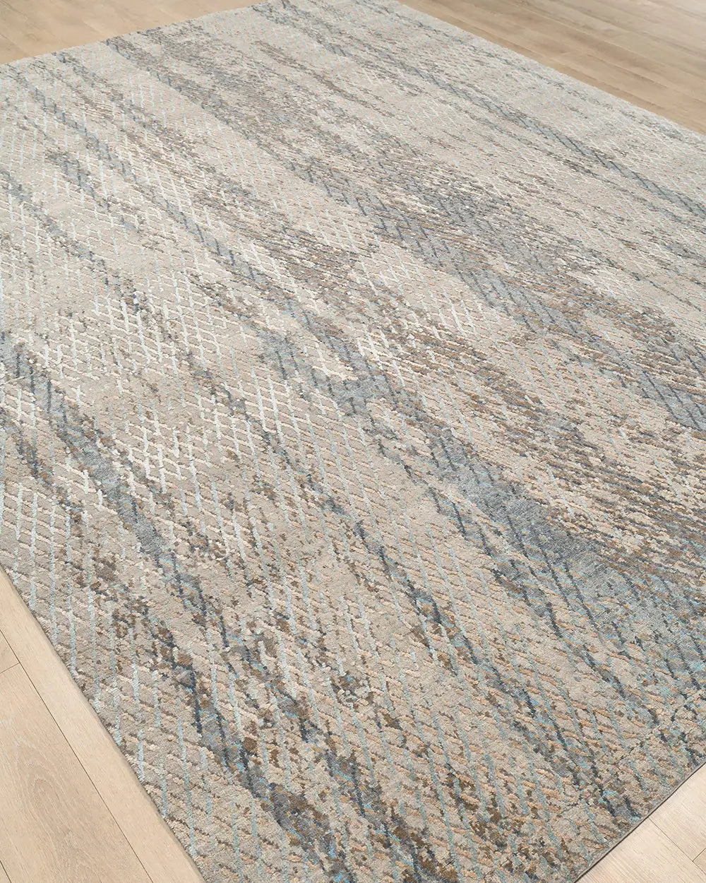 The palette of grey and soft blue creates a calm, balanced atmosphere inspired by distant horizons and softened natural light. Abstract geometric elements add modern character while preserving visual lightness, making the rug highly adaptable to contemporary interiors.