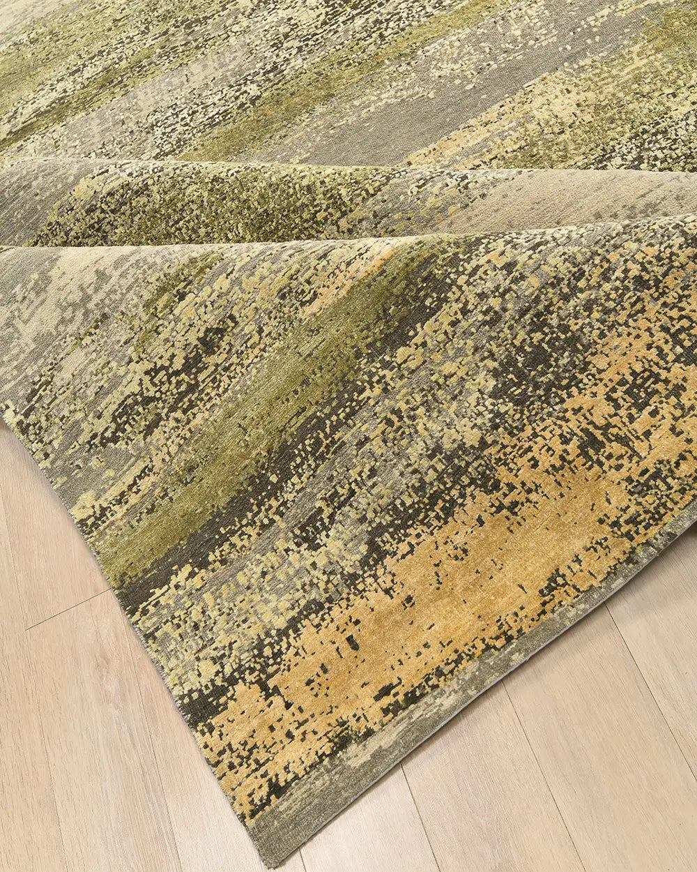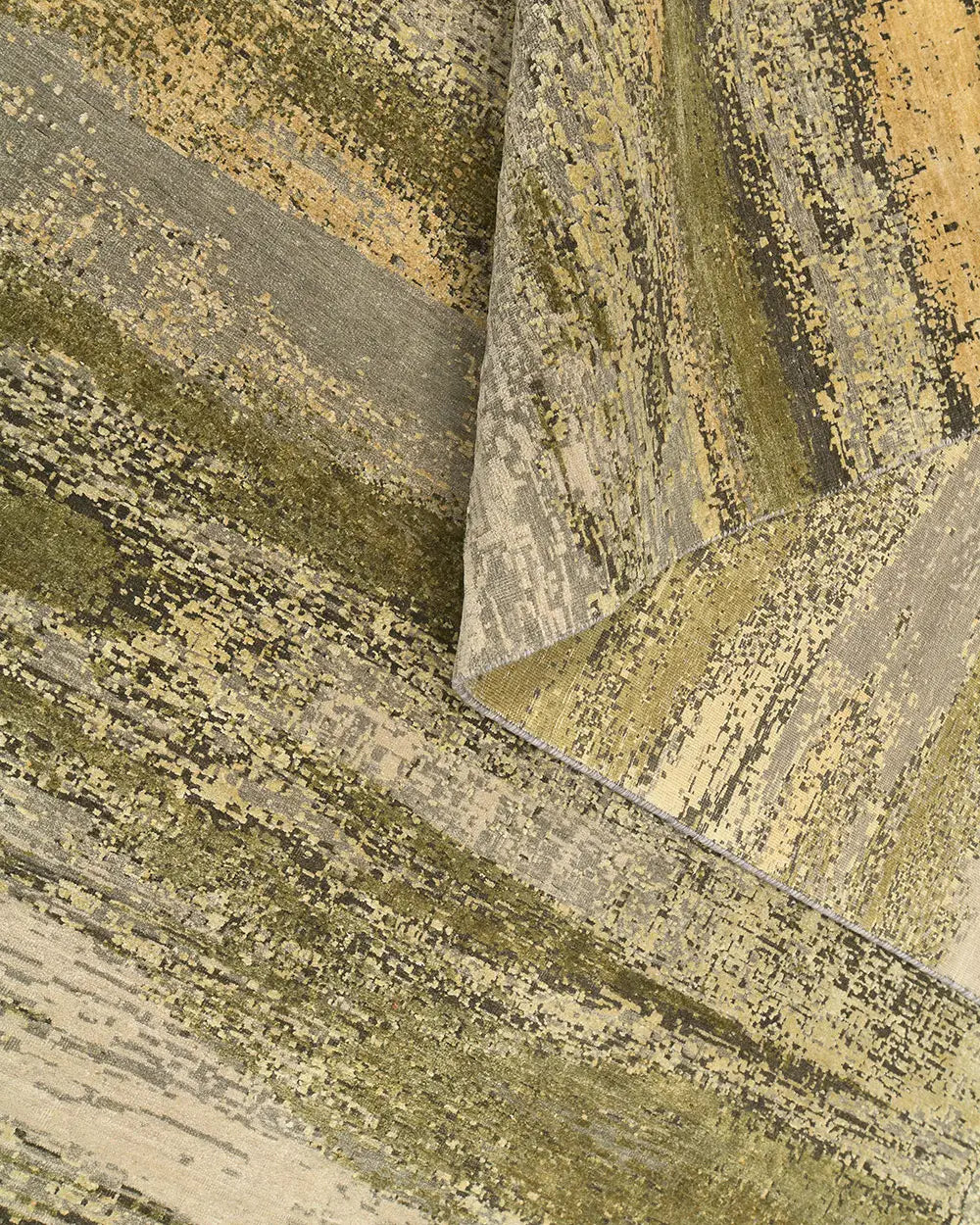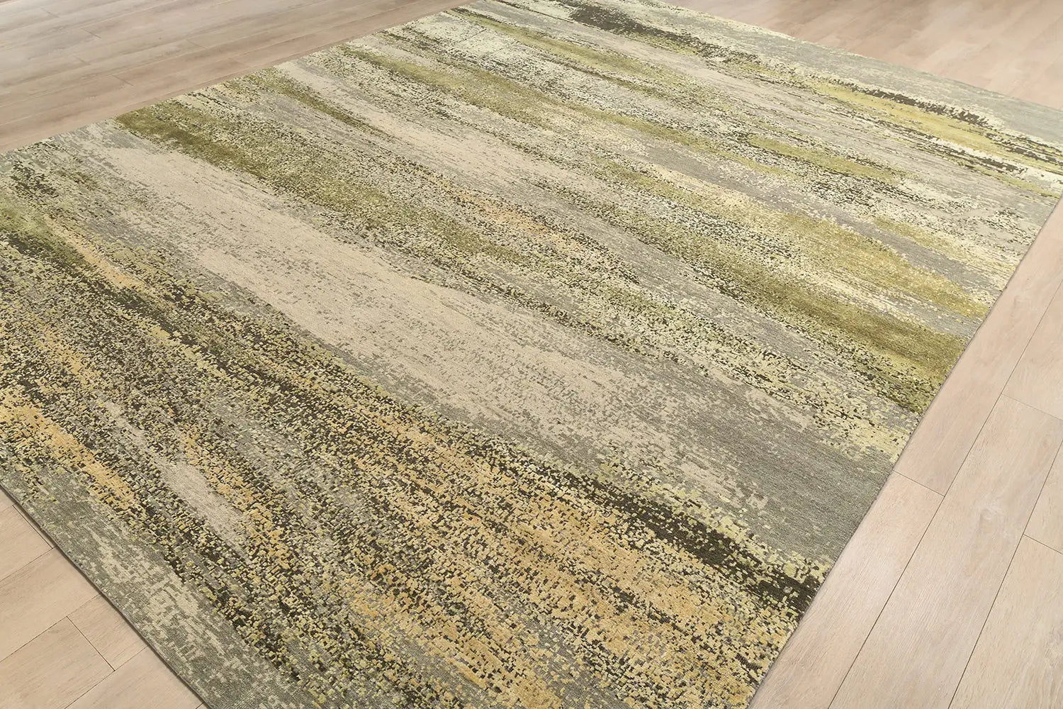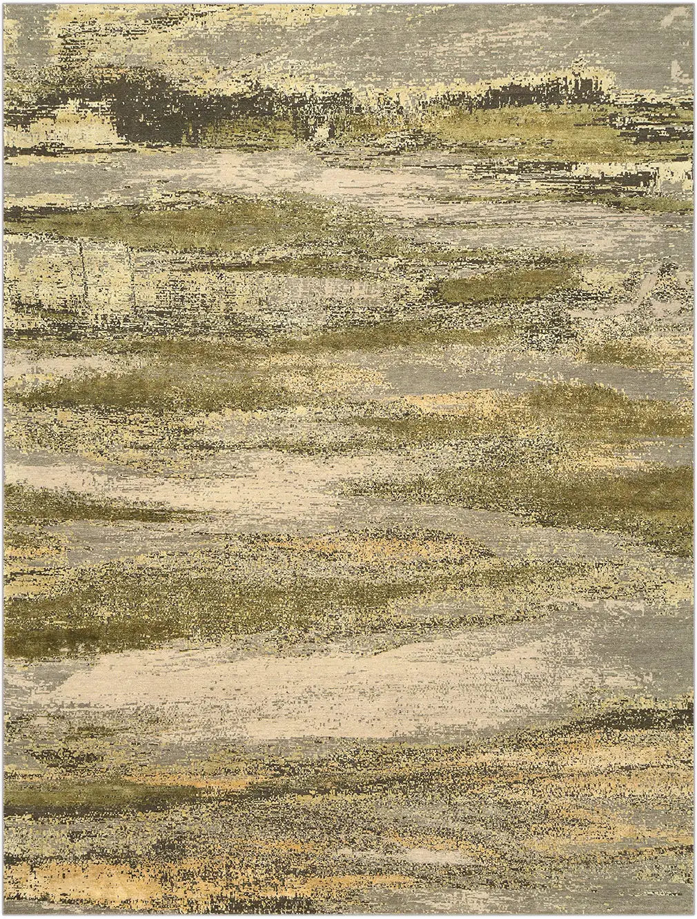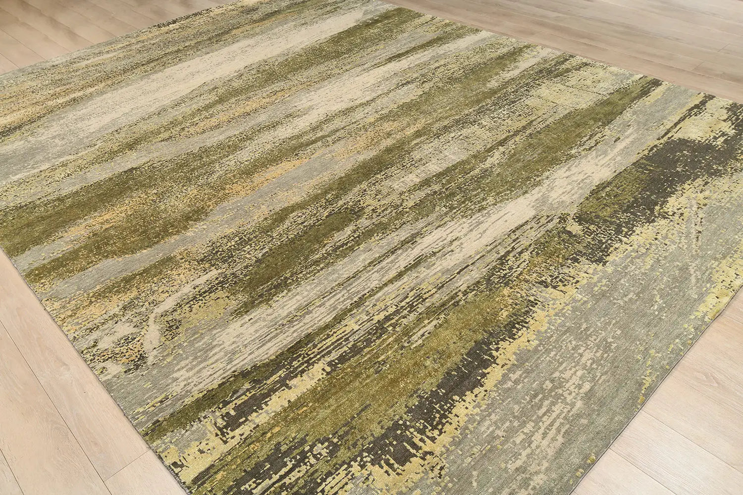 The olive and green palette gives the rug a grounded, elegant character, bringing freshness and balance into contemporary interiors. Its abstract composition works especially well in spaces where natural tones, minimal structure, and modern materials are combined.